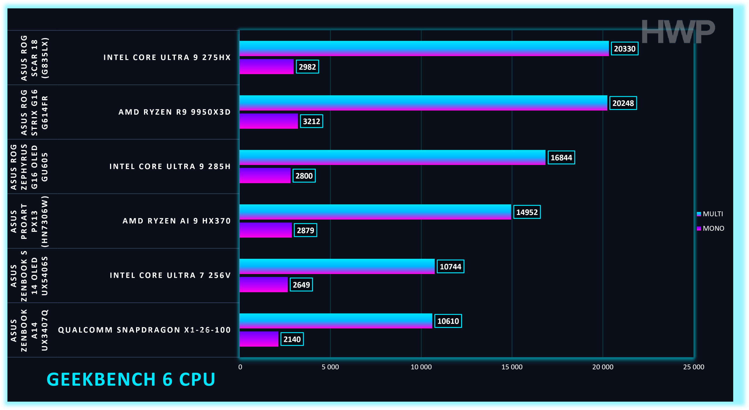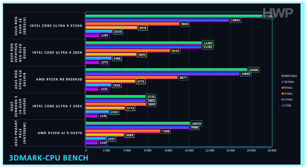 Las pruebas sintéticas sitúan al AMD Ryzen AI 9 HX 370 del ASUS ProArt P16 H7606WX en una posición clara dentro del mercado. No compite con CPUs HX de alto consumo, pero ofrece un rendimiento muy sólido para su formato.