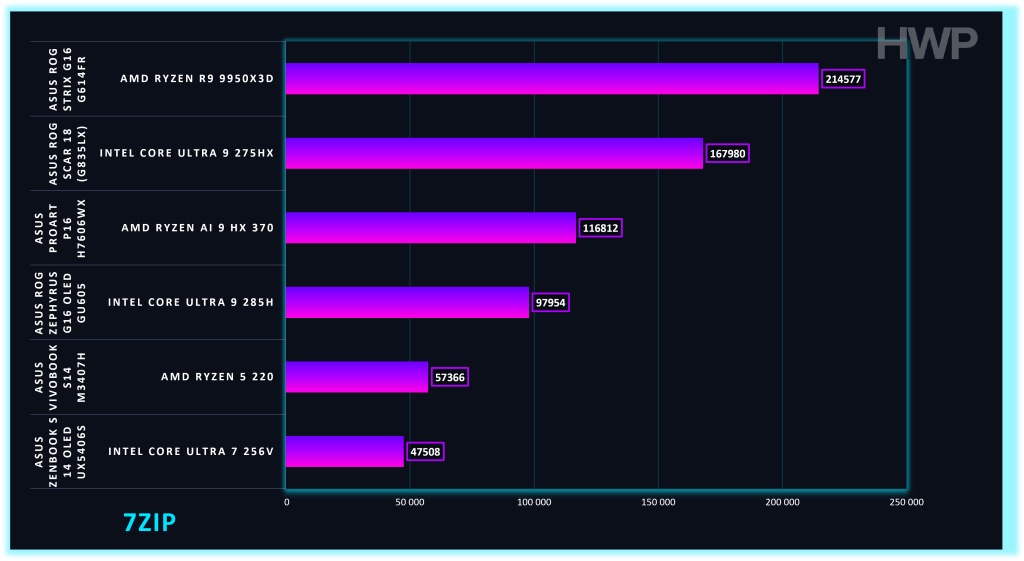 Pruebas como 7-Zip y CPU-Z confirman una buena eficiencia en tareas de compresión, descompresión y cálculo general. Aquí la memoria LPDDR5X a 7.500 MT/s ayuda a mantener un flujo de datos constante.