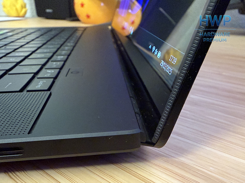 El portátil mide 354,9 × 246,9 × 18,3 mm y pesa alrededor de 1,98 kg. Resulta sorprendentemente compacto si tenemos en cuenta el hardware que integra. La pantalla ocupa gran parte de la tapa gracias a unos marcos muy ajustados. Los laterales son finos, mientras que el borde inferior es algo más grueso por razones estructurales.