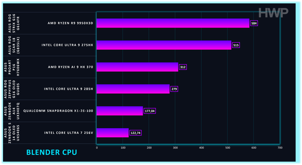 - Creación de contenido: en Blender, los tiempos de render son muy competitivos para un portátil, ideales para 3D, motores en tiempo real y edición avanzada.