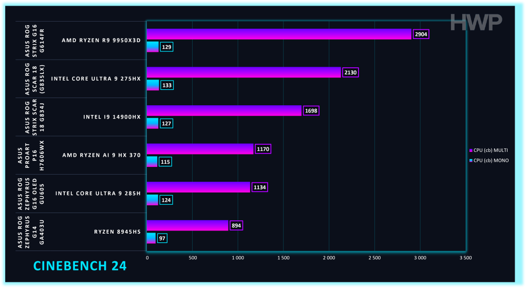 En Cinebench 2024, tanto en mono como en multi núcleo, el HX 370 muestra un comportamiento equilibrado. El rendimiento por núcleo es correcto y suficiente para tareas sensibles a latencia. En cargas multinúcleo, escala bien dentro de su límite térmico.