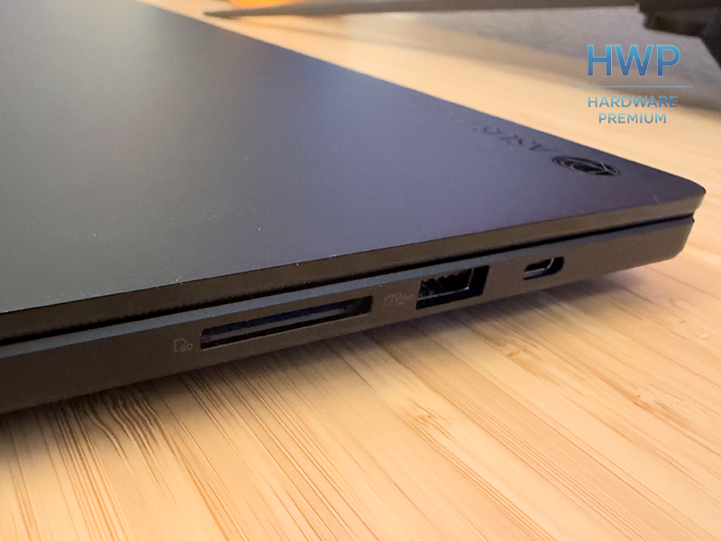 El lateral derecho completa el conjunto con un lector de tarjetas SD de tamaño completo, muy útil para fotografía y vídeo. A su lado se sitúa un puerto USB-C 3.2 Gen 2 con soporte de DisplayPort y carga, junto a otro USB-A 3.2 Gen 2.