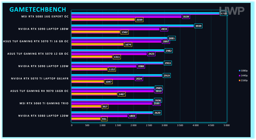 - Rendimiento bruto: en Geekbench 6 GPU se sitúa por delante de las RTX 5080 y 5070 Laptop, mostrando un excelente rendimiento en cargas de cómputo y un uso sólido de la memoria.