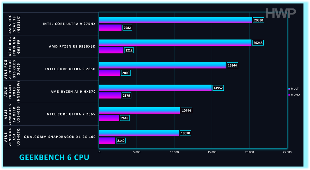 En Geekbench 6, el procesador ofrece resultados coherentes con su enfoque híbrido. El rendimiento multinúcleo es competitivo frente a CPUs móviles de gama alta no HX. En mono núcleo, cumple sin destacar frente a los mejores Intel.