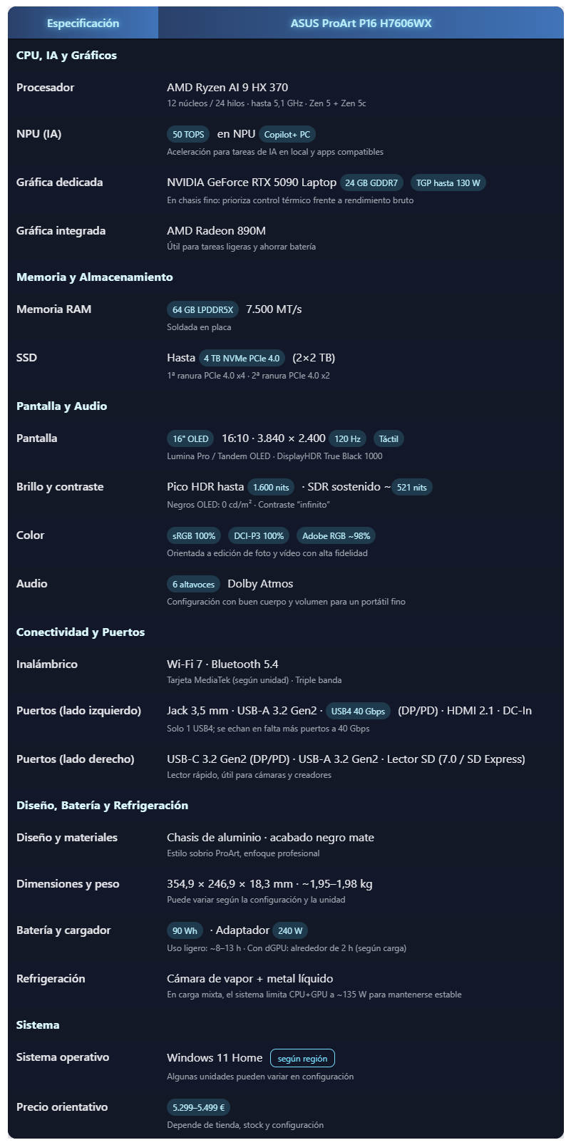 El ASUS ProArt P16 H7606WX se posiciona como una estación de trabajo móvil de alto nivel, diseñada para usuarios que priorizan potencia sostenida, estabilidad y calidad de construcción por encima de la estética gaming tradicional. Su combinación de CPU de última generación, una GPU potente pero bien contenida térmicamente y un sistema de refrigeración orientado a cargas largas lo convierten en un equipo especialmente sólido para creación de contenido, desarrollo, renderizado y flujos profesionales exigentes.