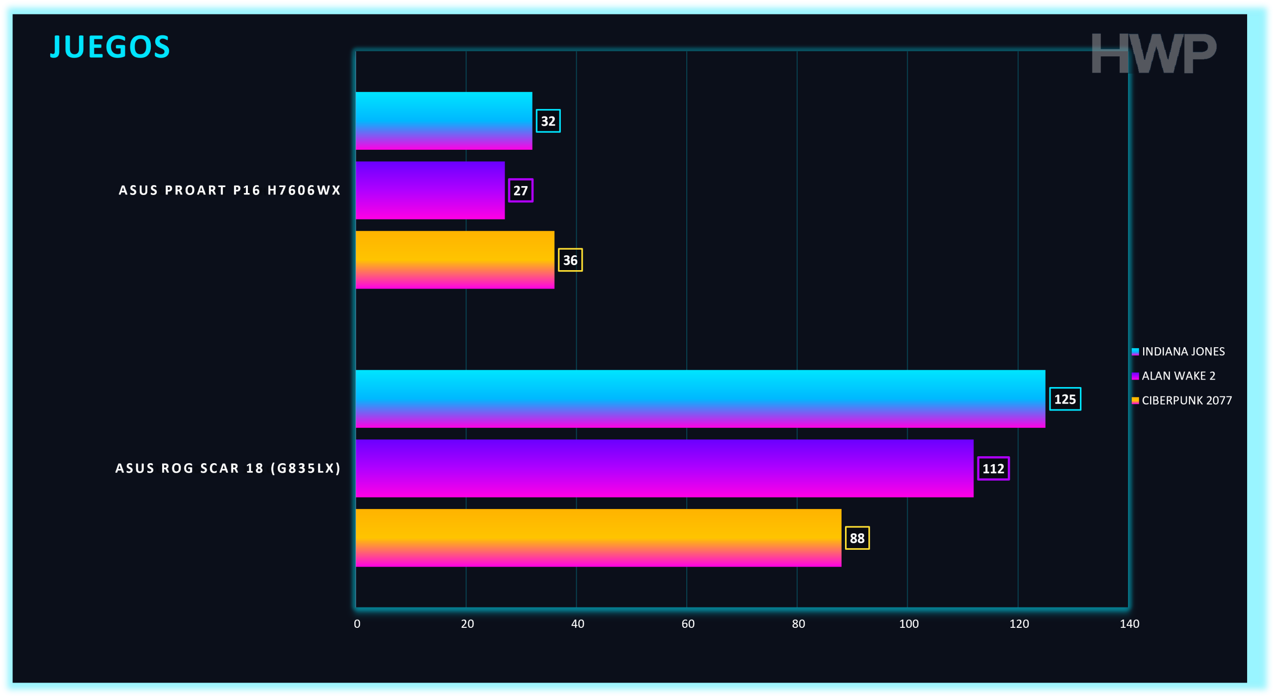 En juegos, ofrece cifras altas, pero queda claro que no busca competir con portátiles gaming de 175 W. El enfoque es creativo, no extremo.