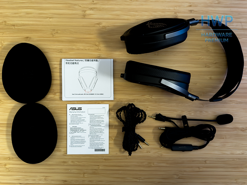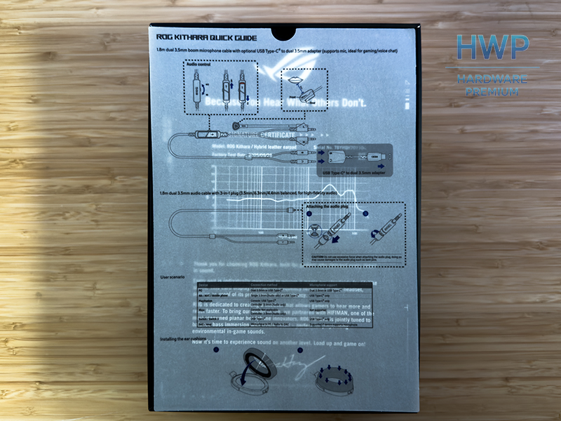Antes incluso de ponerse el ASUS ROG Kithara, la experiencia empieza al abrir la caja. ASUS cuida esta sección con una presentación más cuidada de lo habitual en el gaming. El interior está bien ordenado y los materiales dan buena sensación, lejos de una caja básica. Incluye una pequeña lámina con información de pruebas y datos, un detalle poco común que deja claro que se trata de un producto pensado con cuidado.