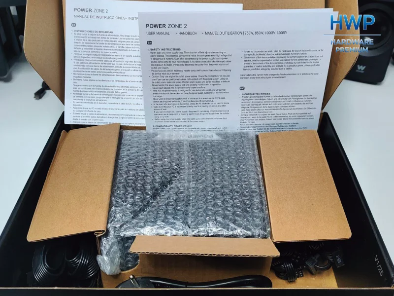El planteamiento del embalaje y los accesorios en la Power Zone 2 de 1200 W es prácticamente el mismo que ya vimos en el modelo de 850 W, algo lógico teniendo en cuenta que ambas fuentes comparten esquema. La caja protege bien el conjunto, y al abrirla todo aparece bien organizado: la fuente envuelta en plástico de burbujas, los cables agrupados y la documentación colocada en la parte superior.