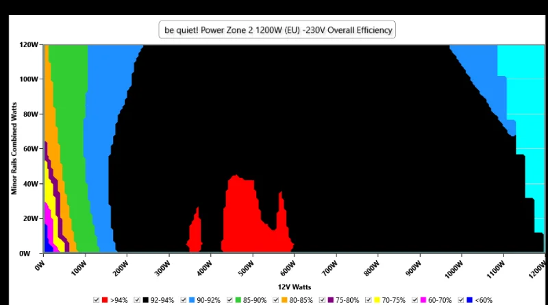 El mapa de eficiencia deja bastante bien retratada la personalidad de la Power Zone 2 de 1200 W. La mayor parte del área útil se mueve en rangos altos, con una franja muy amplia por encima del 92 %, especialmente cuando el peso del consumo recae en el raíl de 12 V.