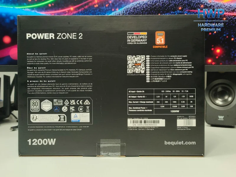 La be quiet! Power Zone 2 de 1200 W sigue la estela de sus hermanas menores, algo que ya da una pista del tipo de producto que hay dentro. El diseño es muy discreto: fondo negro, el nombre del modelo bien visible y una imagen de la fuente sin adornos. Para rematar, los certificados 80+ Platinum y Cybenetics Platinum se ubican en el lateral superior izquierdo.