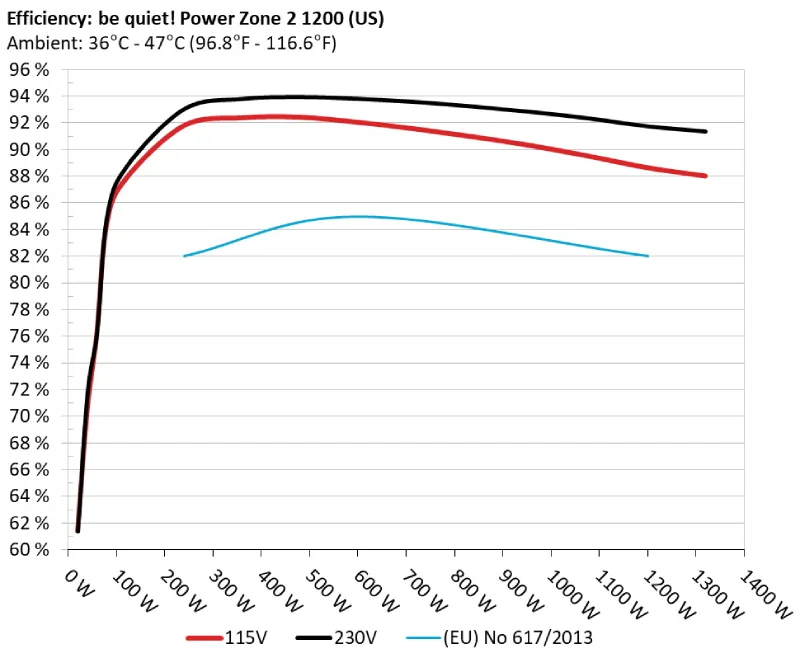 A 230 V, la Power Zone 2 roza el 94 % en su mejor punto, manteniéndose por encima del 92 % durante un tramo muy amplio del rango operativo. Incluso cerca de su potencia máxima, la eficiencia sigue en cifras altas, lo que habla bien tanto del diseño LLC como de la rectificación síncrona del raíl de 12 V.