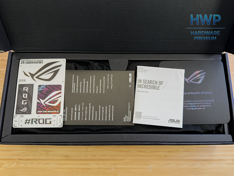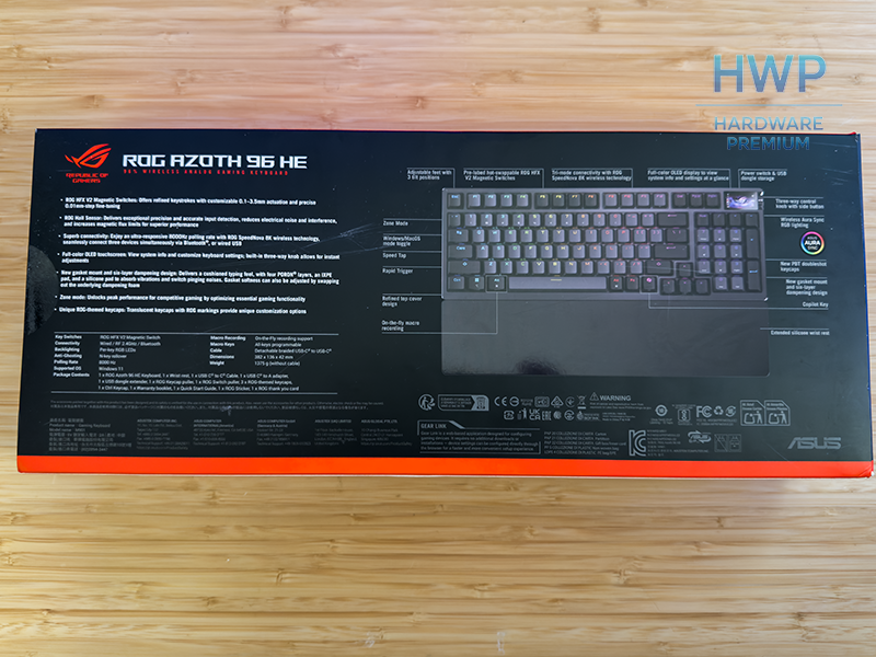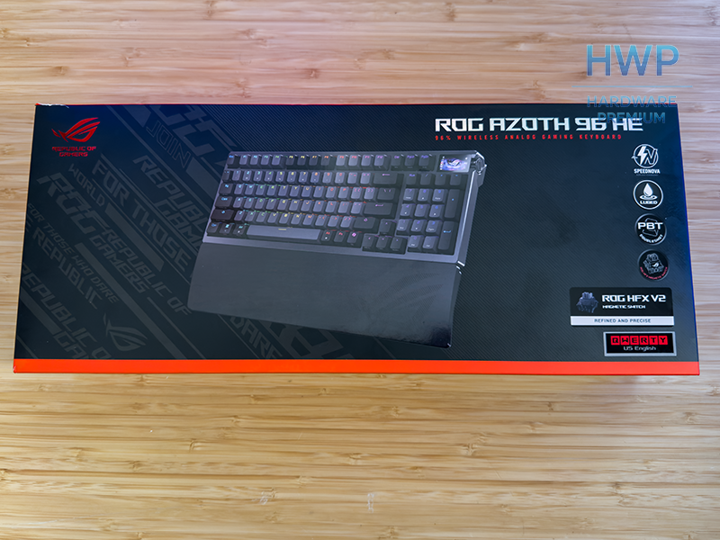 Desde el primer momento, el ROG Azoth 96 HE deja claro que juega en la gama alta. La caja sigue la línea clásica de ROG: fondo oscuro, detalles en rojo y una imagen protagonista del teclado donde la pantalla OLED y el formato 96% son el foco. No es un embalaje recargado; transmite producto serio, técnico y bien posicionado.