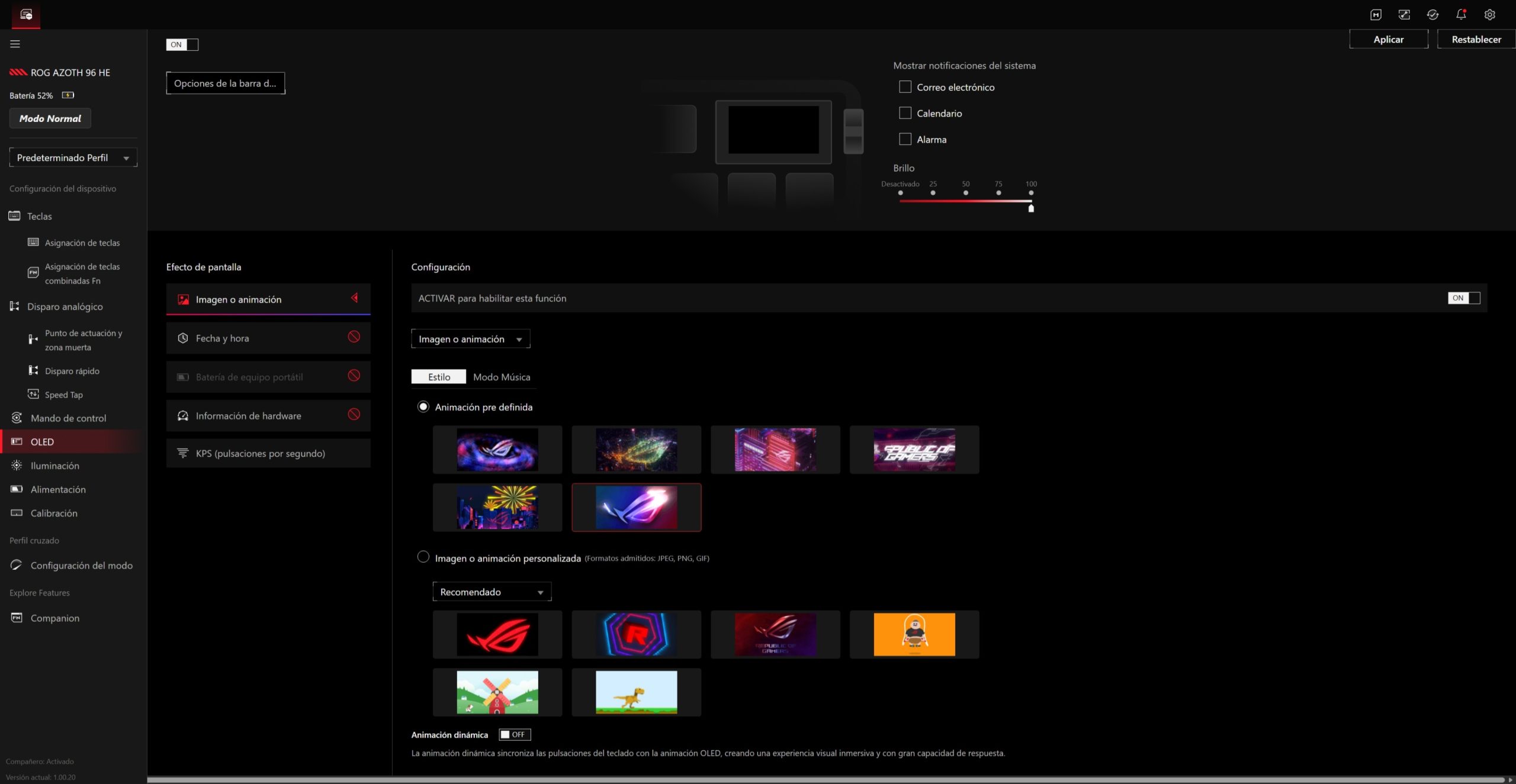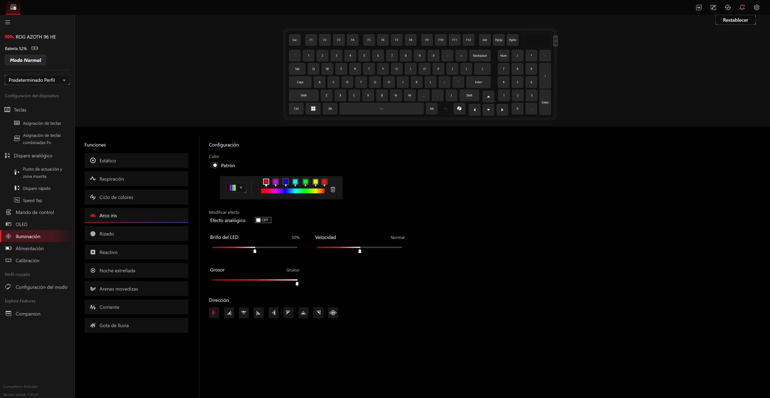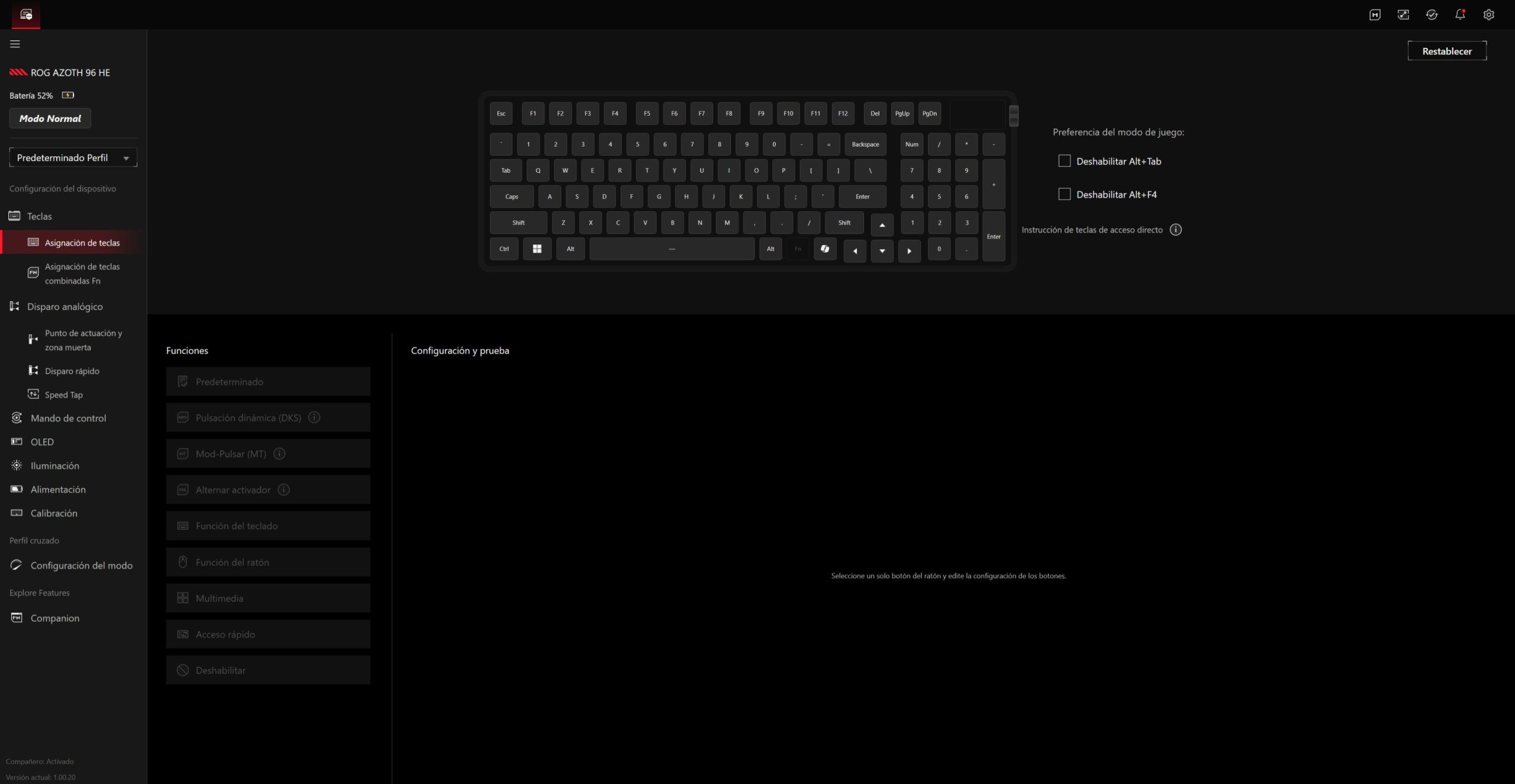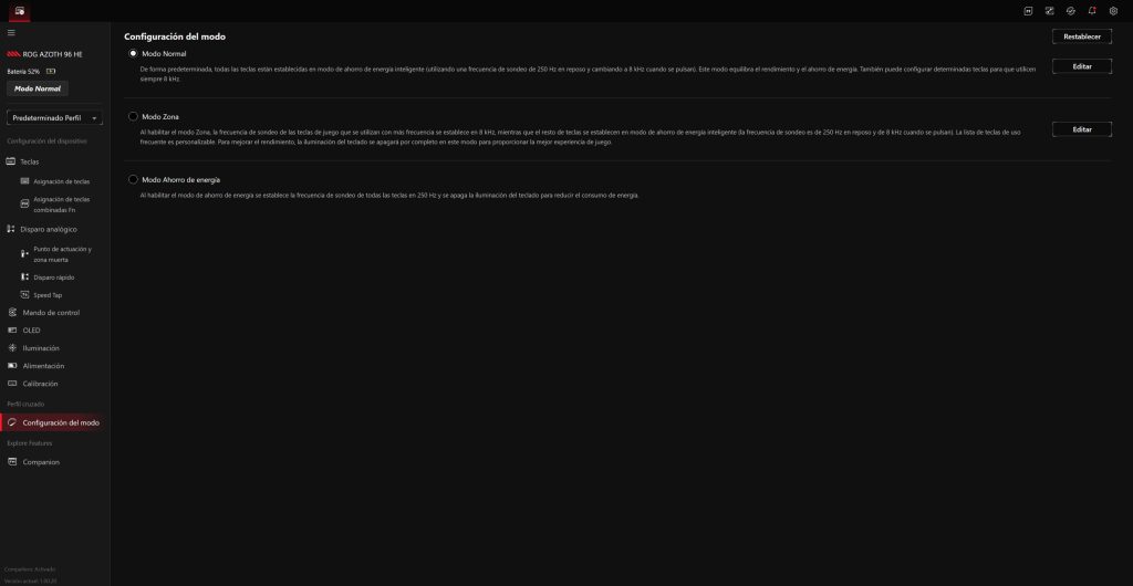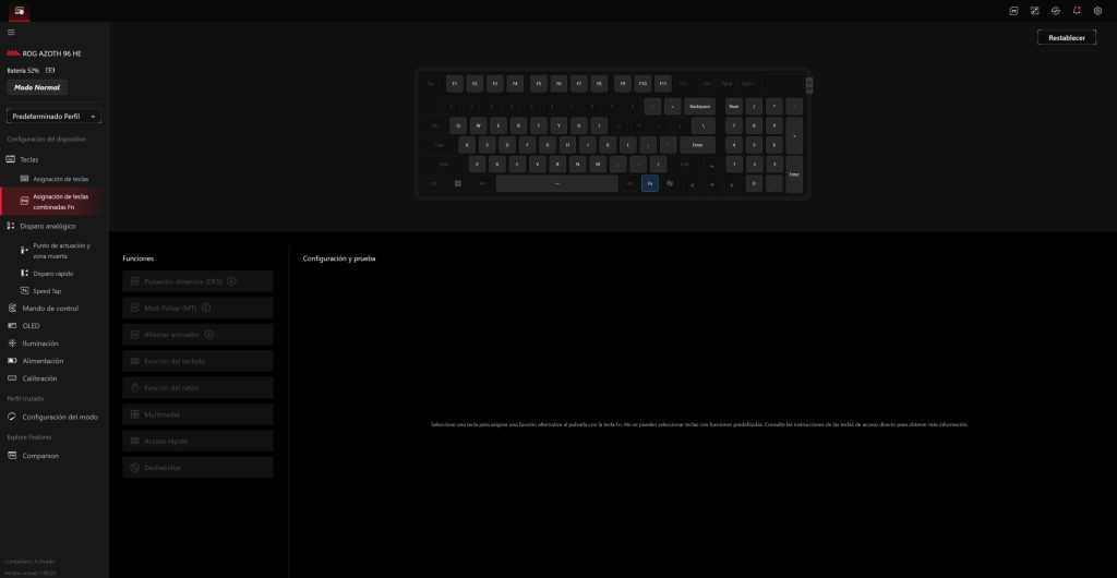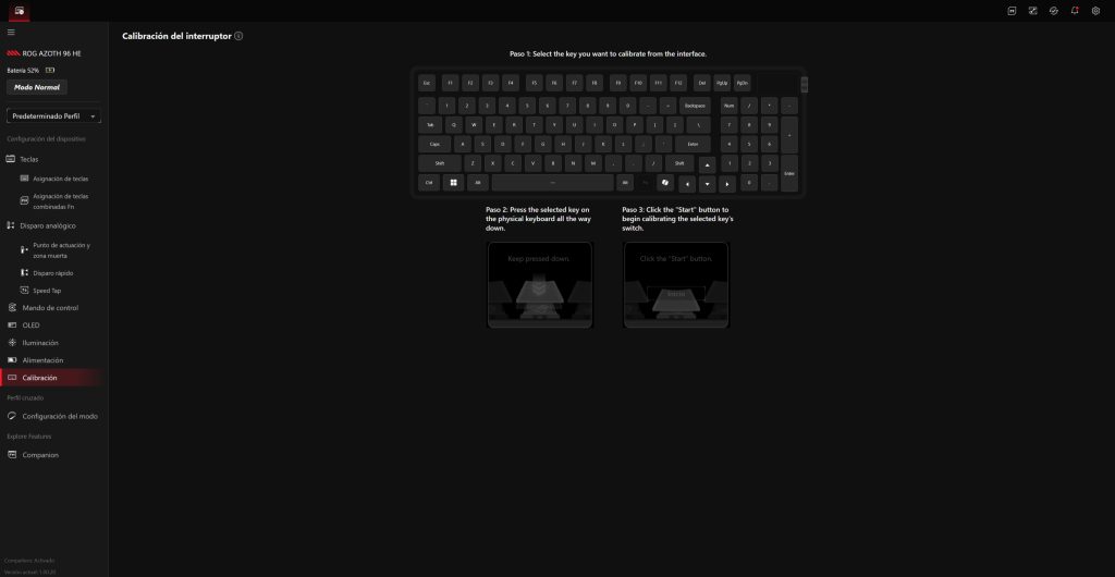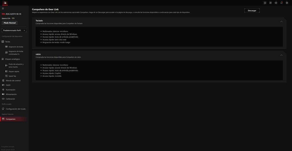 El ROG Azoth 96 HE se gestiona a través de Gear Link, la plataforma web de ASUS que sustituye al clásico software pesado instalado en segundo plano. La idea es clara: abrir el navegador, conectar el teclado y tener acceso inmediato a todas las funciones sin llenar el sistema de servicios residentes.
