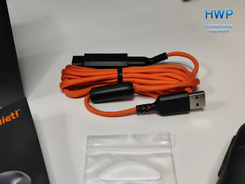 En cuanto al contenido, el conjunto es más completo de lo habitual. Además de la documentación, be quiet! incluye un juego de skates de repuesto. También encontramos el cable USB-C a USB-A para carga y uso cableado, junto con el adaptador para el dongle inalámbrico, permitiendo acercar el receptor al ratón si queremos minimizar interferencias. El propio dongle de 2,4 GHz viene integrado en este conjunto, formando un pack único y ordenado.