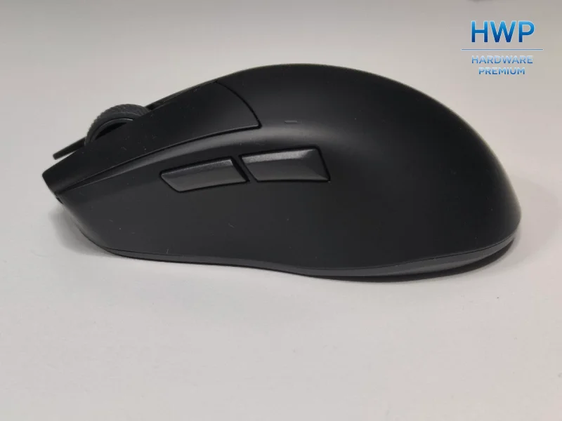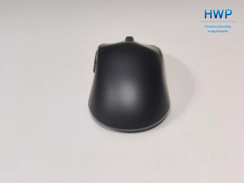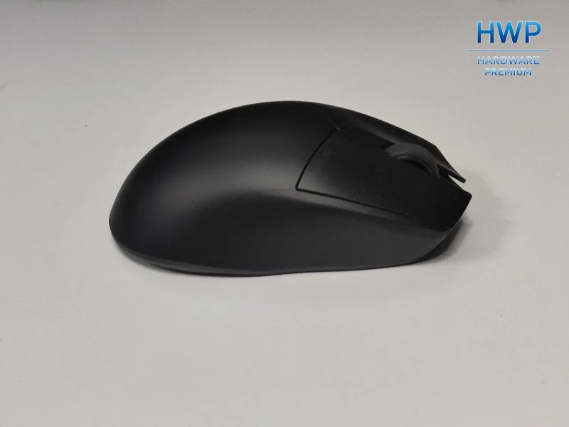 La forma ergonómica está pensada para usuarios diestros. El cuerpo presenta una joroba pronunciada pero bien repartida, ofreciendo un apoyo para la palma sin forzar la muñeca. El lateral izquierdo incorpora una ligera concavidad que ayuda a encajar el pulgar de forma natural, mientras que el derecho cae de manera progresiva, facilitando un agarre estable tanto en palm grip como en claw relajado.