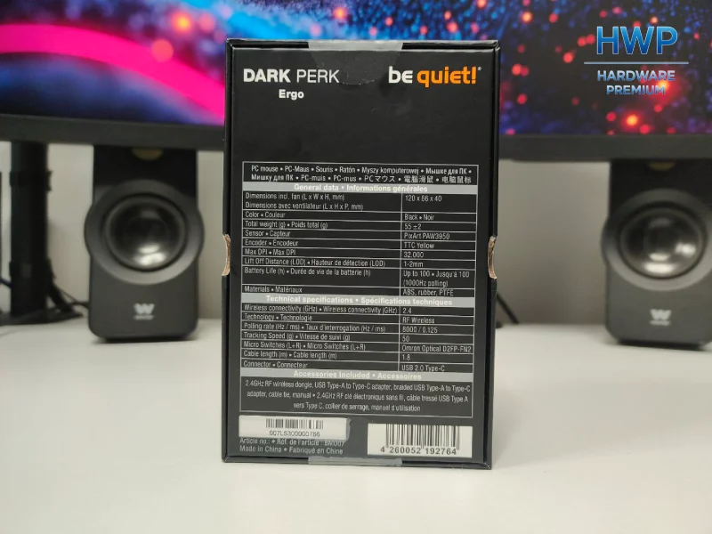 El be quiet! Dark Perk Ergo llega en un embalaje donde predomina el negro mate, con una presentación limpia y bien estructurada. Lo justo para identificar el modelo, y una parte trasera bien organizada donde se detallan las especificaciones del dispositivo que tenemos entre manos. Todo viene bien protegido, con el ratón firmemente encajado y los accesorios separados para evitar roces durante el transporte.