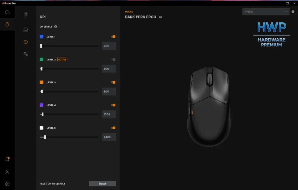 Desde el IO Center podemos ajustar prácticamente todo lo relevante: niveles de DPI, tasa de sondeo, distancia de despegue (LOD), opciones como angle snapping, motion sync o ripple control, además de la reasignación de botones y creación de macros. Además, estas configuraciones se guardan en la memoria interna del ratón, por lo que una vez ajustado podemos prescindir completamente del software.
