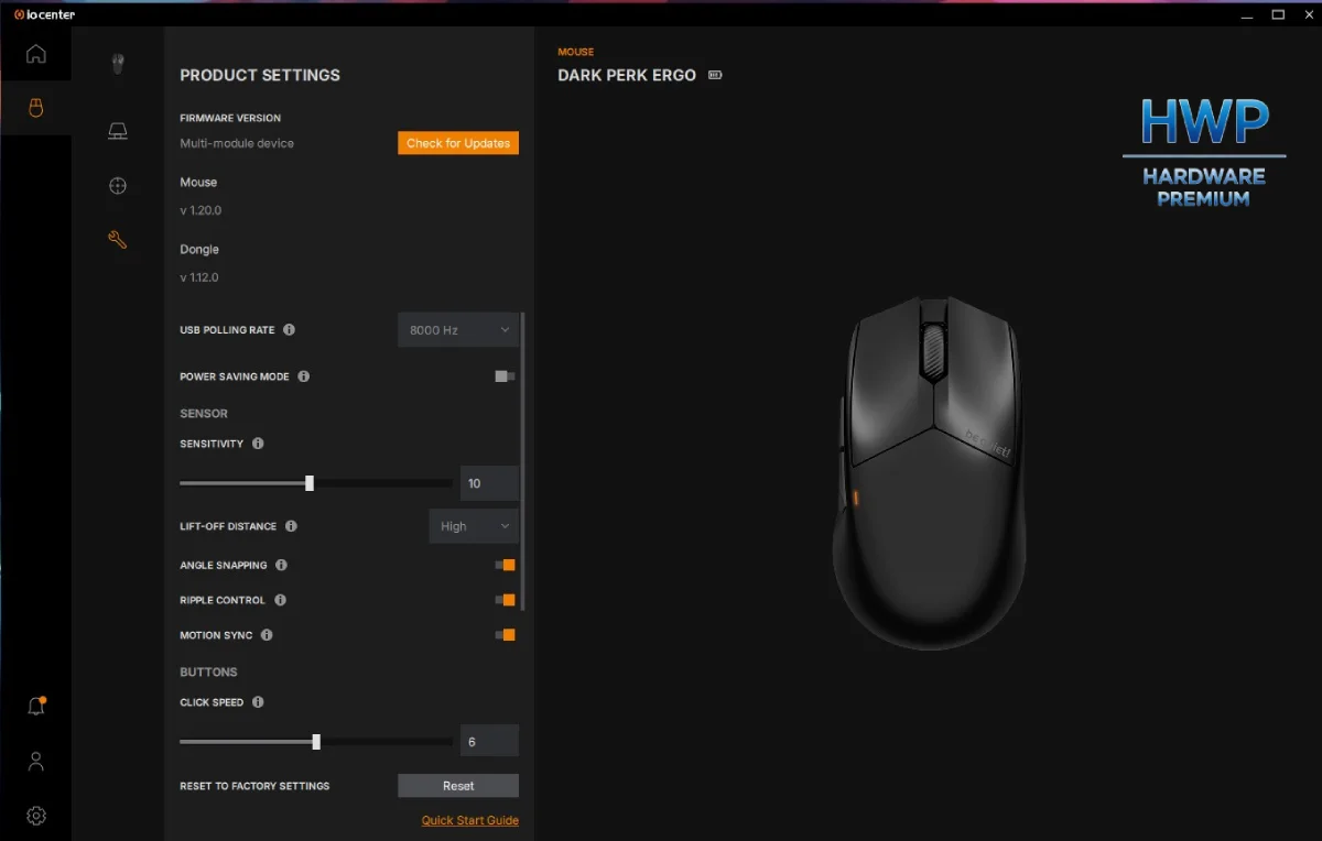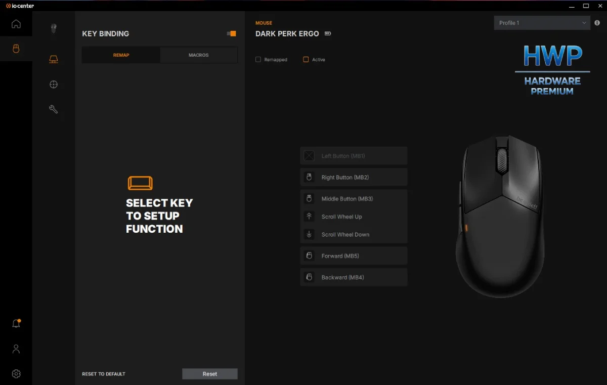 Para gestionar el Dark Perk Ergo, be quiet! utiliza su plataforma IO Center, el mismo software que da soporte a su nueva gama de periféricos. Está disponible tanto en versión de escritorio como en versión web, una apuesta interesante que permite configurar el ratón sin necesidad de instalar nada si no queremos. A nivel visual, la interfaz es limpia y moderna, con un diseño oscuro, bien organizado y fácil de entender incluso para usuarios menos avanzados.