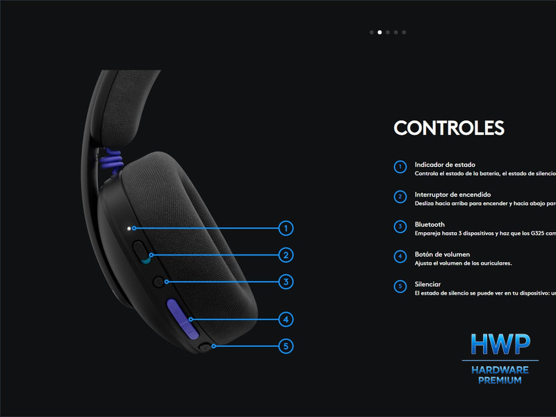 Principalmente, para un usuario que busca sencillez, la botonera de los Logitech G325 Lightspeed es un ejercicio de buen hacer. El diseño es intuitivo y evita distracciones innecesarias. En la copa izquierda encontramos un esquema de control vertical muy bien presentado, de arriba a abajo tenemos: