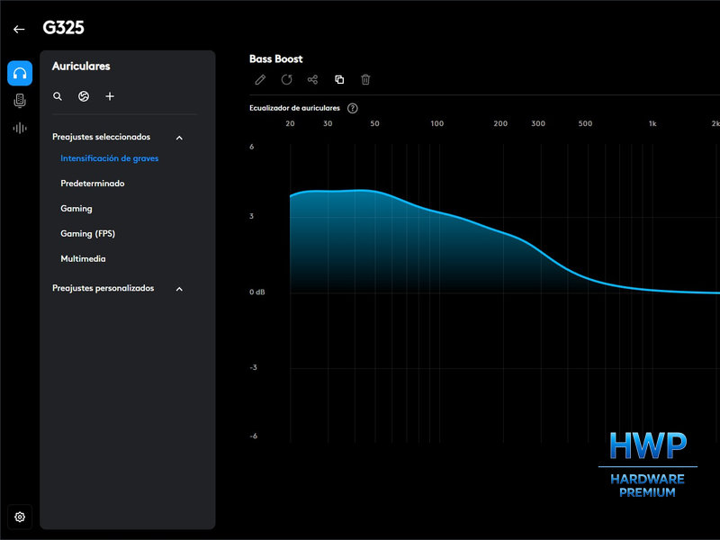 Un punto a favor de estos Logitech G325 Lightspeed, son las aplicaciones para controlarlos. Primero, en ordenador tenemos la aplicación de Logitech G HUB. Por otro lado, Logitech G Mobile es para móvil. Nosotros hemos probado la de ordenador y está claro que esta aplicación transforma unos excelentes auriculares en una herramienta muy completa. Para el audiófilo que no se conforma con el perfil plano de fábrica, entrar en G HUB es como acceder a la cabina de un ingeniero de sonido. Desde aquí puedes exprimir el audio de 24 bits mediante un ecualizador avanzado que responde con una fidelidad asombrosa a cada ajuste de banda. La aplicación nos permite realizar los siguientes ajustes: