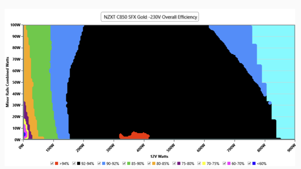 Sobre el papel, la NZXT C850 SFX Gold cuenta con certificación 80 Plus Gold, pero cuando analizamos datos reales a 230V (nuestro escenario en Europa), el comportamiento es claramente superior a lo que su etiqueta comercial sugiere.