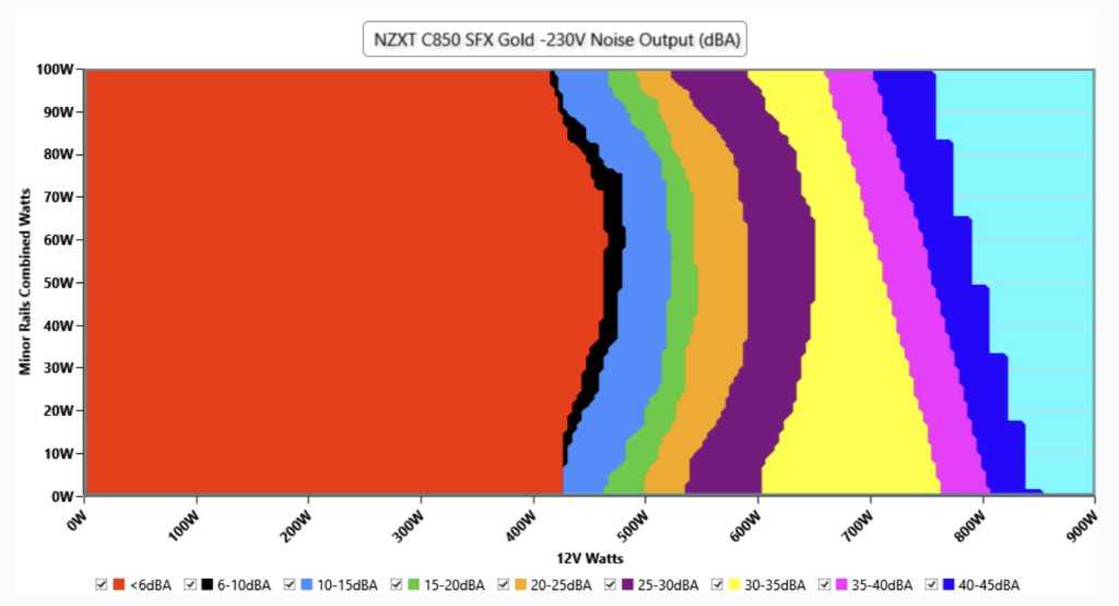 La NZXT C850 SFX Gold cuenta con certificación Cybenetics A- en ruido, algo muy positivo para una SFX de 850W. No debemos olvidar además que estamos hablando de un formato compacto con ventilador de 92 mm, lo que implica ciertas limitaciones físicas frente a modelos ATX de 120 o 140 mm.