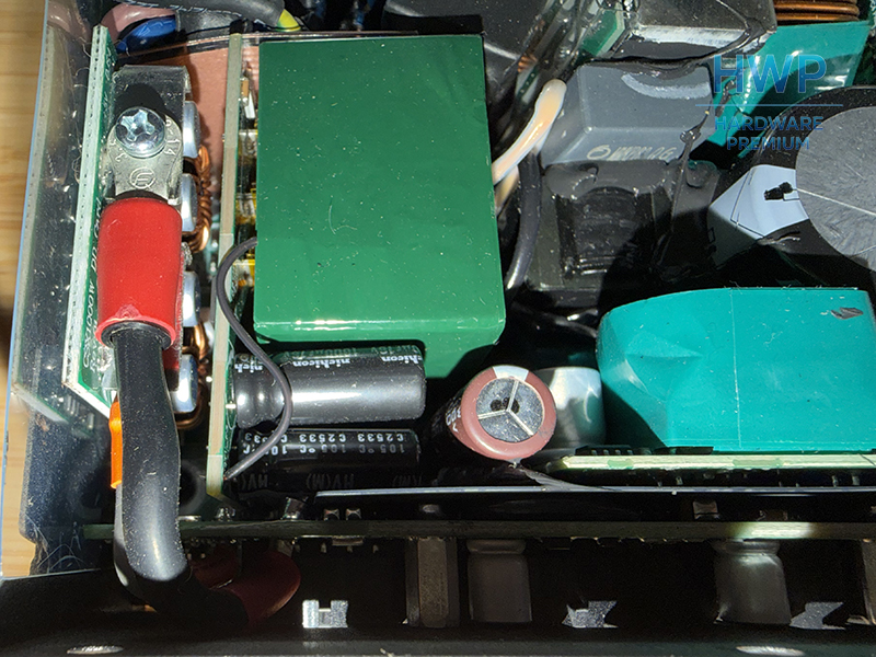 Uno de los puntos fuertes es el uso de condensadores 100% japoneses de 105 °C, tanto en primario como en secundario.