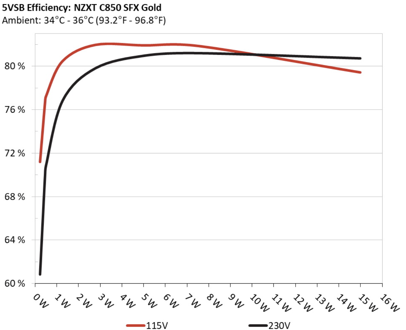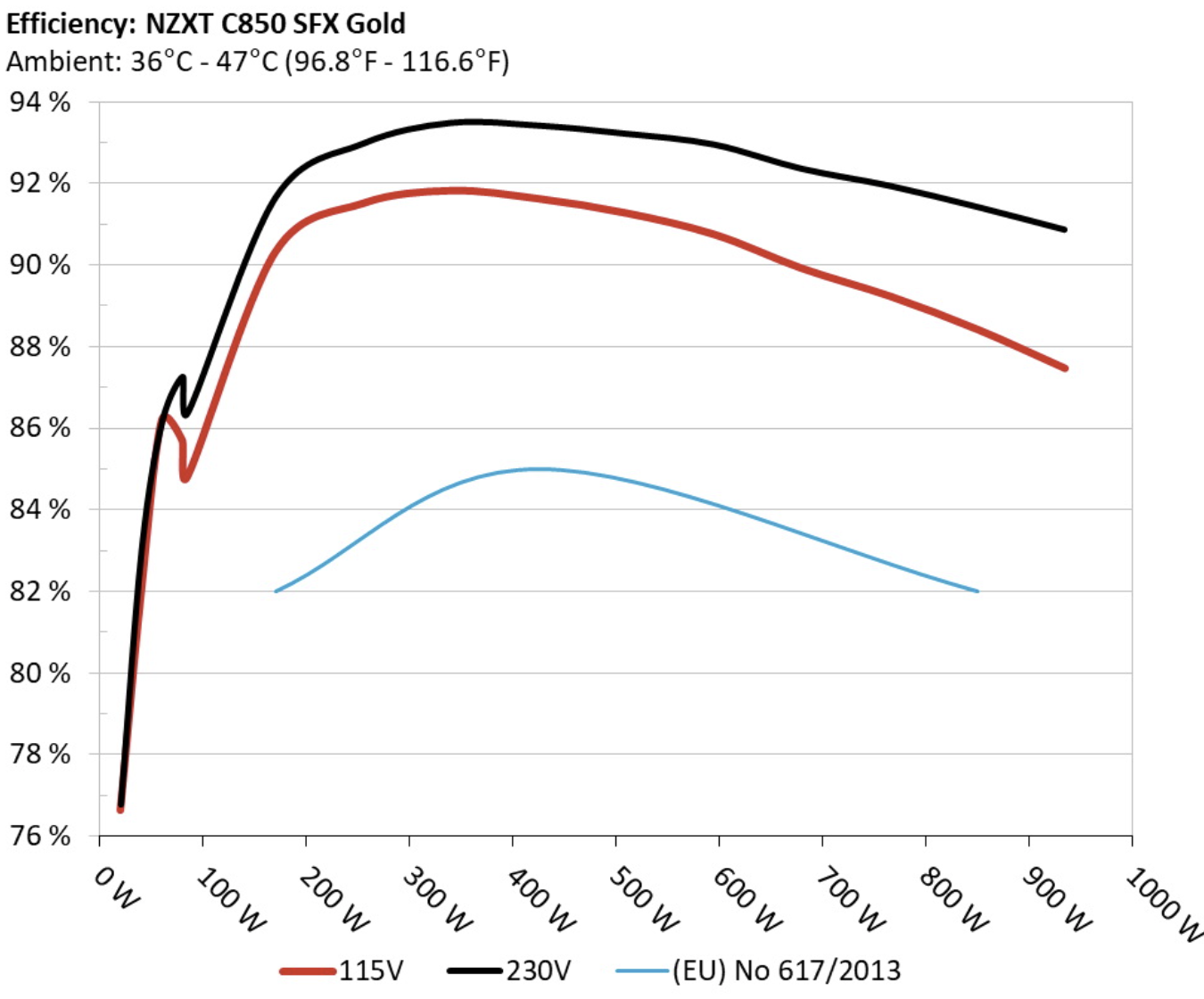 Sobre el papel, la NZXT C850 SFX Gold cuenta con certificación 80 Plus Gold, pero cuando analizamos datos reales a 230V (nuestro escenario en Europa), el comportamiento es claramente superior a lo que su etiqueta comercial sugiere.