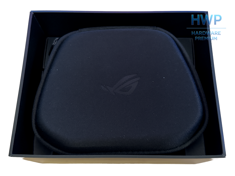 Casi todo el contenido viaja dentro de un estuche rígido de transporte con el logotipo ROG en relieve. Por dentro cuenta con rejilla elástica para el cable, hueco moldeado para el mando y un bolsillo interior para el resto de piezas. El añadido más útil es un ojal con cierre en el lateral que permite pasar un cable de carga sin sacar el mando del estuche. Detalle pequeño, pero se nota cuando viajas.