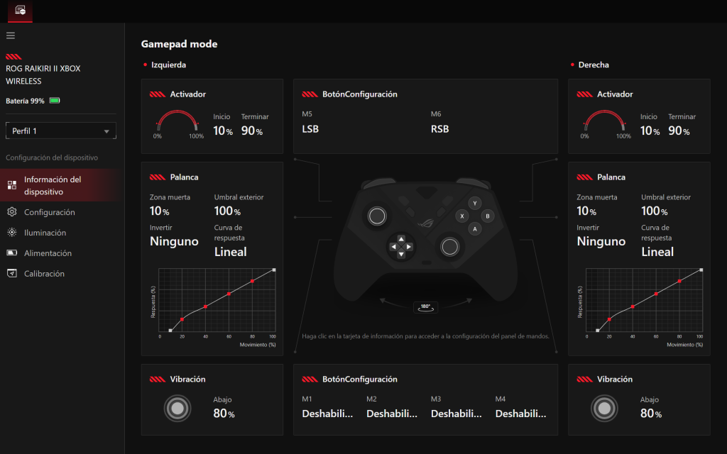 La pantalla principal muestra una representación del mando con accesos directos. Desde ahí configuras hasta cinco perfiles, las curvas de respuesta de los joysticks con tres modos predefinidos y dos personalizables, las zonas muertas de los gatillos y el comportamiento de los botones extra. La vibración se ajusta por motor de forma independiente. Esto permite atenuar el rumble de un puño sin tocar el otro.