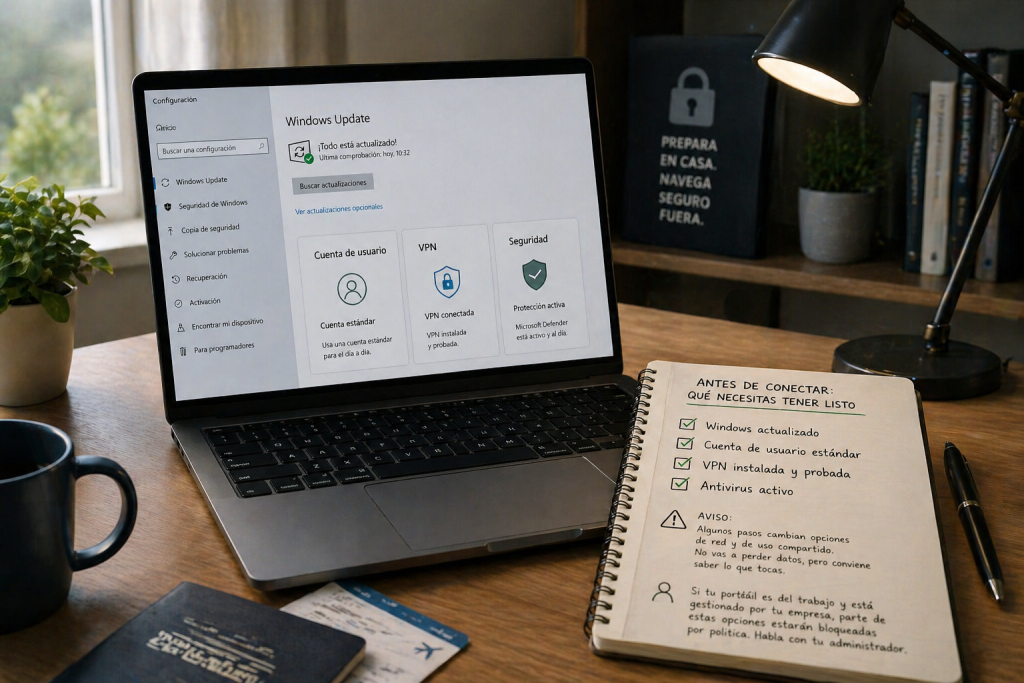 Conectarse a la Wi-Fi pública del aeropuerto, del hotel o de la cafetería de turno es cómodo, gratis y, mal usado, una de las formas más rápidas de regalar credenciales a un desconocido. Este tutorial te lleva, paso a paso, por la configuración exacta que debes tocar en Windows 11 (con notas para Windows 10) antes, durante y después de conectarte. Tiempo estimado: entre 10 y 15 minutos la primera vez. Después, dos minutos cada vez que cambies de red.