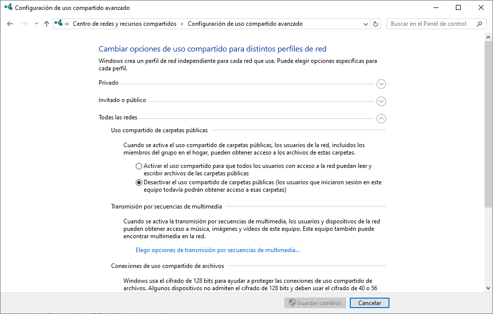 2. Entra en Centro de redes y recursos compartidosCambiar configuración de uso compartido avanzado.