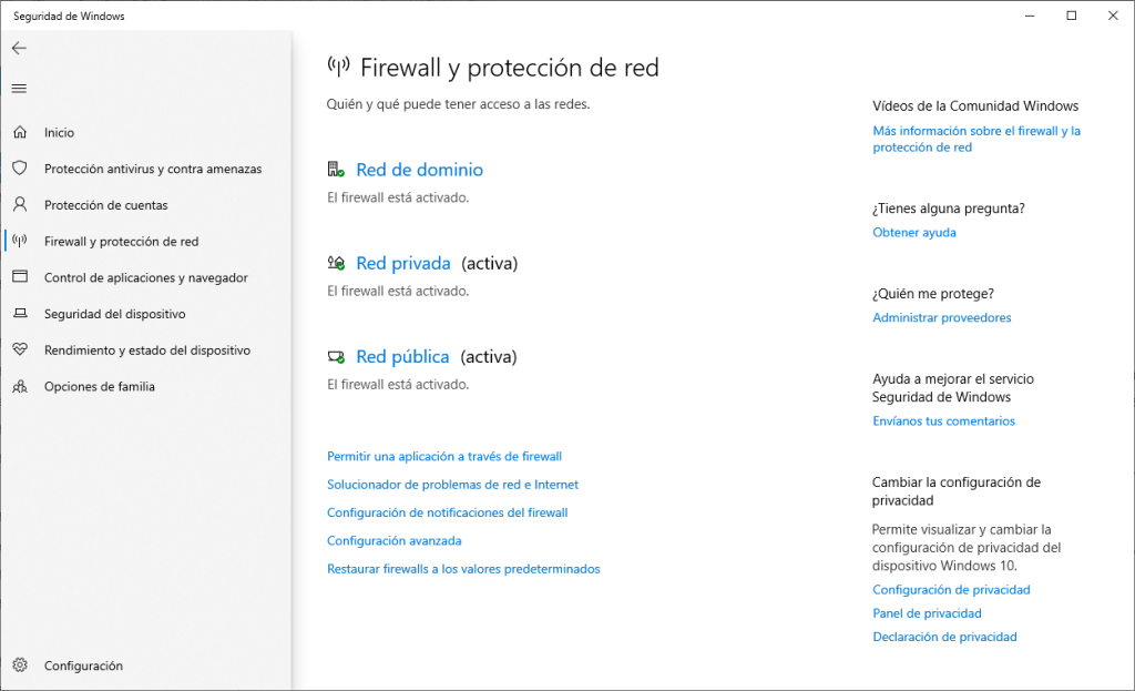 Windows trae un firewall decente, pero conviene comprobar que el perfil Público está activo y bloqueando conexiones entrantes por defecto.
